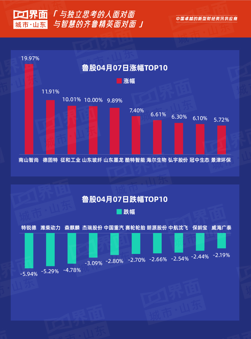 受大盘影响,4月7日,山东工142只个股上涨,81只个股下跌,南山智尚以19.97%领涨山东板块。