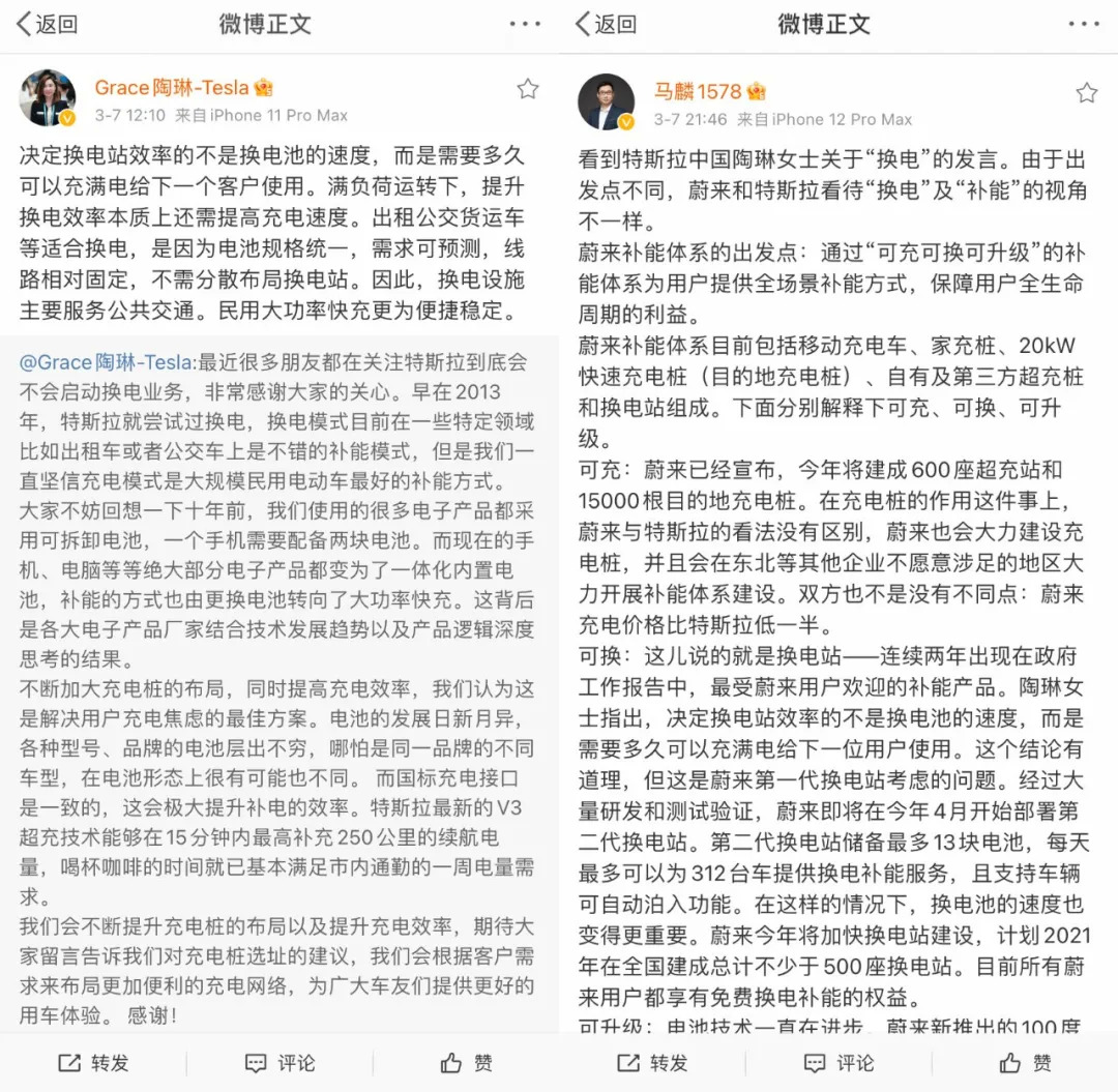 不过最近,关于换电和超充,蔚来和特斯拉在微博上掐了起来。原因是特斯拉(上海)有限公司的经营范围中新增了“新能源汽车换电设施销售”,“特斯拉开始试水换电了”立即引发热议。特斯拉全球副总裁陶琳立马在微博上否认,顺便踩了一下力挺换电的友商。蔚来急了,企业传播高级总监马麟回怼:“换电是最受蔚来用户欢迎的补能产品。”