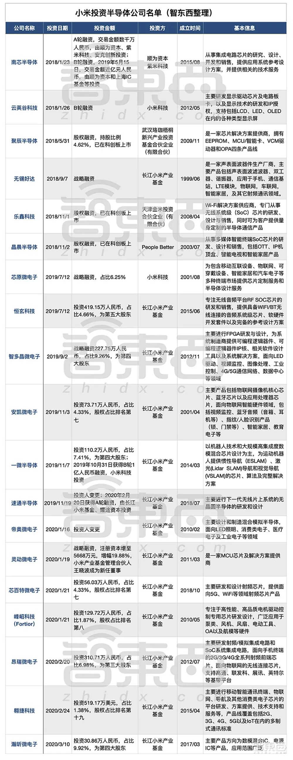 附:从2018年初到2020年3月小米投资半导体公司名单