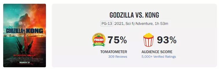 从口碑来看,《哥斯拉大战金刚》在IMDb上的平均分为6.9分(近4万个评价),优于《哥斯拉2:怪兽之王》的6.0分;而《哥斯拉大战金刚》的烂番茄新鲜度达到75%,同样高于《哥斯拉2:怪兽之王》的42%。