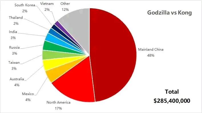 据IMDbPro统计,《哥斯拉大战金刚》的海外首周票房达到1.23亿美元。其中,内地市场以6920万美元一枝独秀,占到整体成绩的50%以上;同时,《哥斯拉大战金刚》在韩国和港台地区也都稳居榜首,东亚市场再度成为好莱坞影片的主力票仓。除此之外,俄罗斯(696万美元)、澳大利亚(586万美元)和墨西哥(534万美元)也排名前列,均创下当地今年好莱坞影片的开画新高。