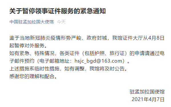 疫情严峻、政府封城,中国驻孟加拉国大使馆暂停领事证件服务