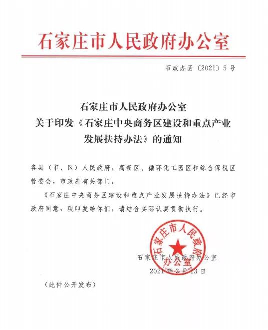 3月13日,石家庄市人民政府办公室印发了《石家庄中央商务区建设和重点产业发展扶持办法》,有力促进石家庄中央商务区早日“出形象、成规模、见成效”,进一步增强产业集聚和招商引资的承载力、吸引力。