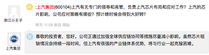 上汽集团在互动平台表示,芯片问题是目前全球汽车行业共同面临的问题。汽车芯片短缺的主要原因是供需不平衡。公司正通过加强全球供应链协同等措施尽量减小影响。虽然芯片短缺情况会持续一段时间,但上汽有很强的产业链体系优势,将与行业一起克服困难。