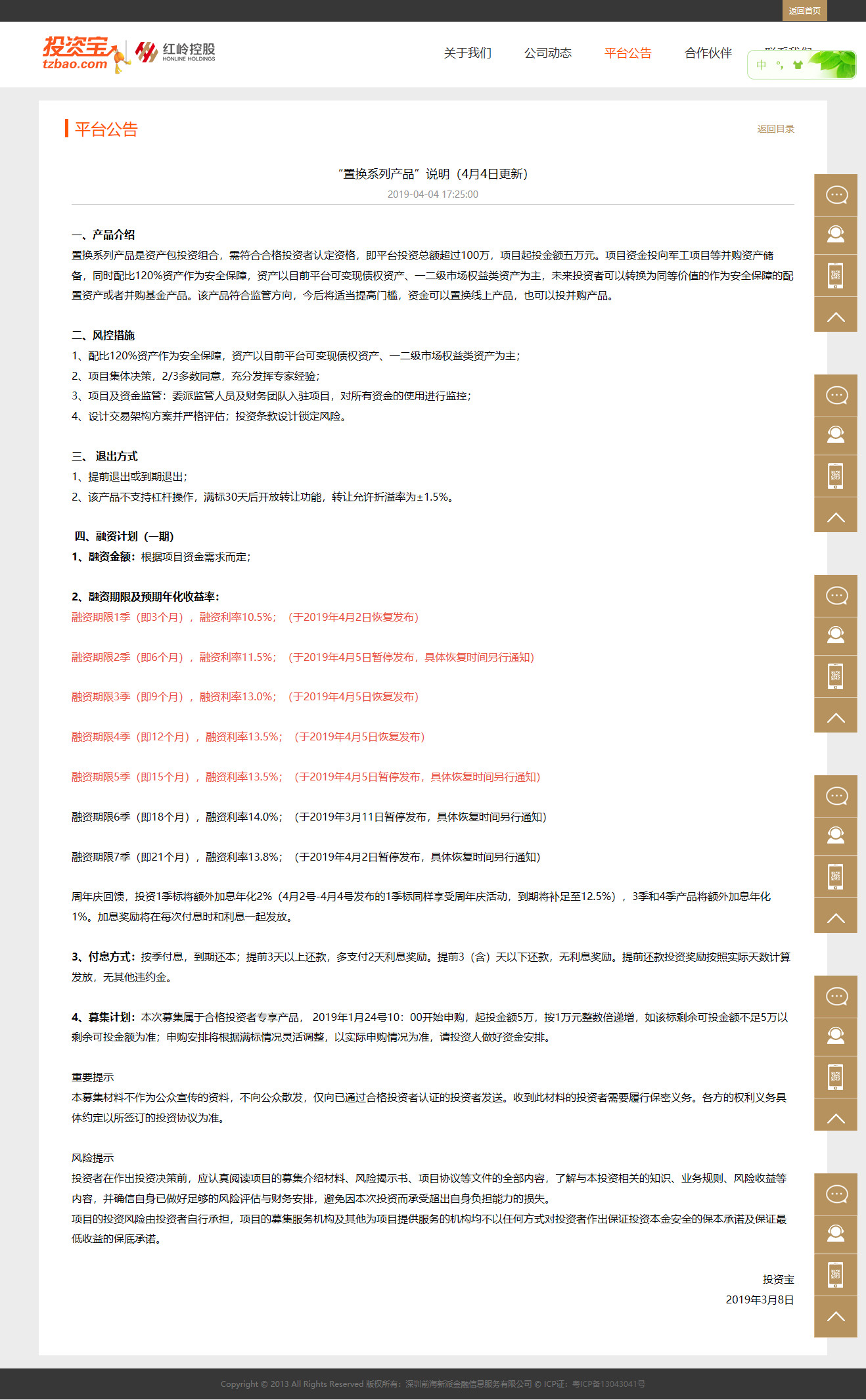 “今日上午10:00将在投资宝发布‘置换系列产品’:1季(3个月)11.5%,2季(6个月)12.5%,5季(15个月)14.5%,均为按季付息,到期还本。”4月4日,也发布了相关置换系列产品的信息。