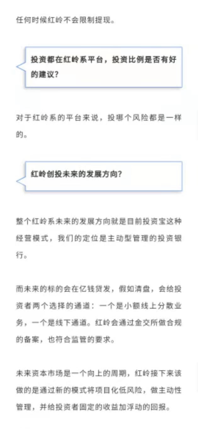此外该篇文章表示,“红岭的资产能把债权覆盖掉,南通总部的大楼资产、上市公司的股票资产,这些都会用来保证平台和投资者资金的安全。终极风险(最坏的情况)就是最迟晚个半年拿到钱,但是你的钱不会拿不回去。”