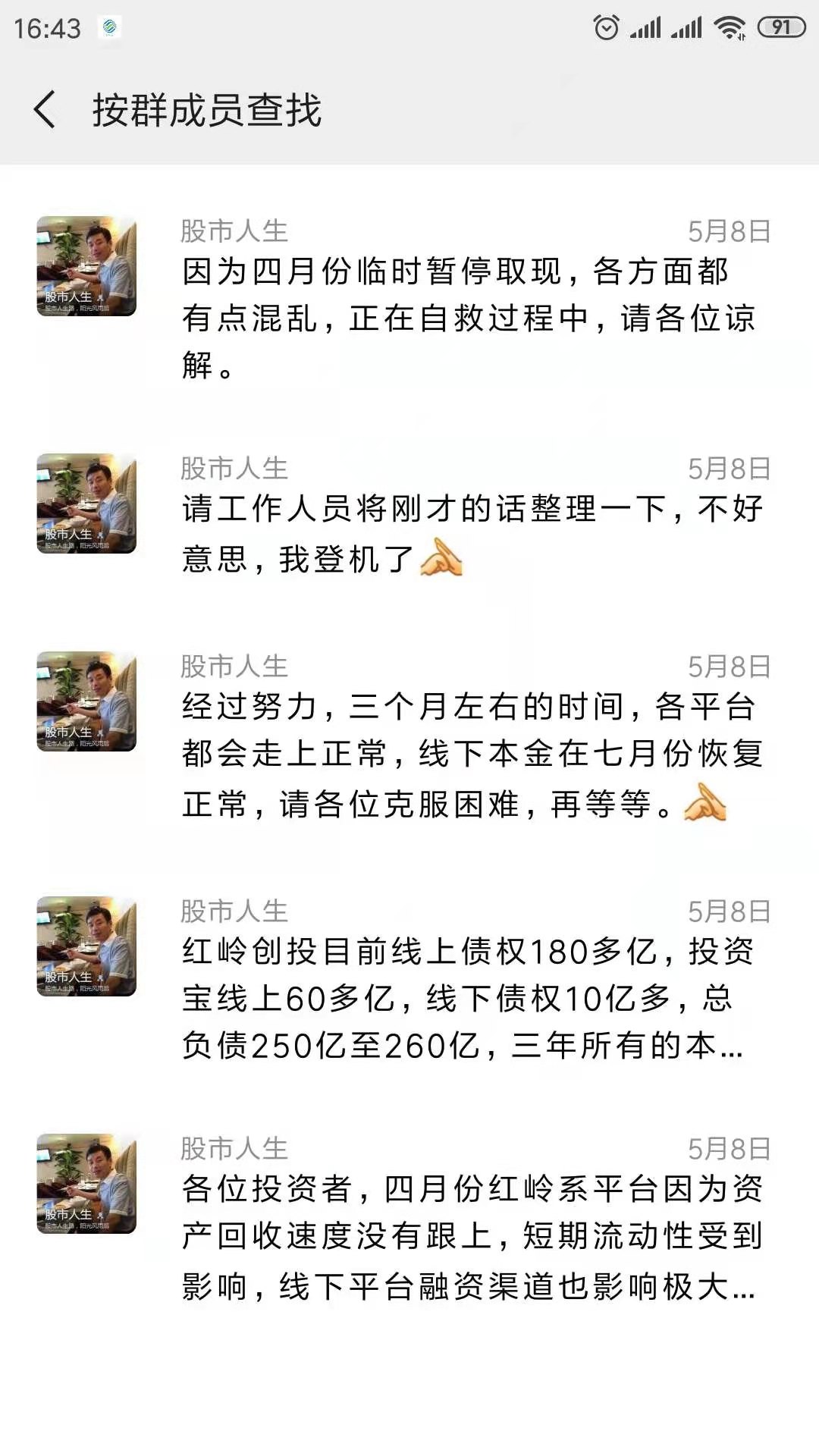 根据上述红岭资本核心出借人提供的群聊天截图显示,2019年5月,周世平在红岭资本官方微信群中表示,“线下债券只是流动性管理产品,资产质量不影响大家的债权回收。”周世平在当时的群聊中表示,红岭目前的问题主要是流动性管理问题。