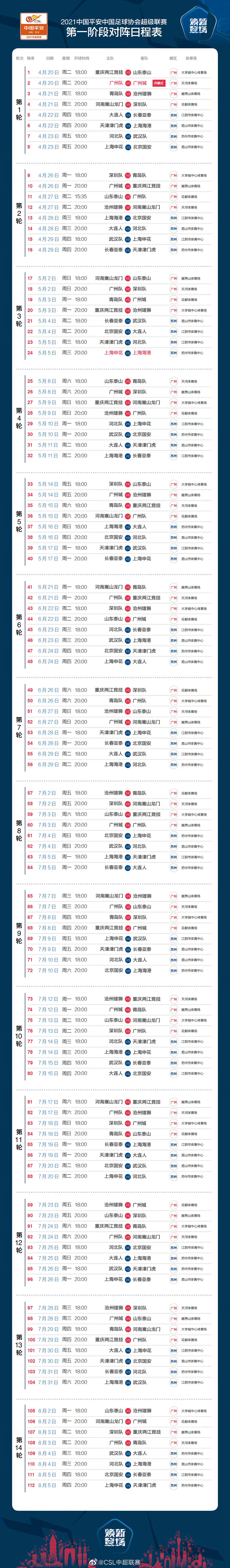 北京时间2021年4月8日,中超联赛官方公布2021赛季第一阶段赛程。