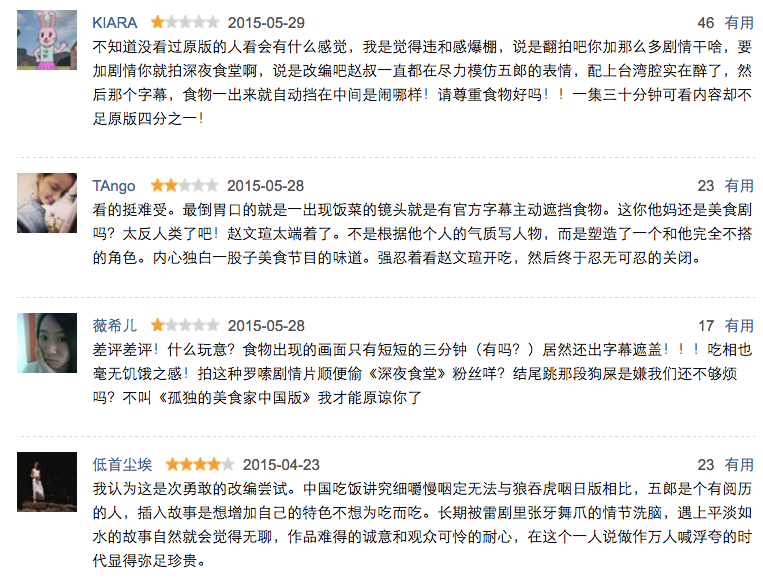 该剧在豆瓣的评分只有4.4分,有网友评论认为,中文版《孤独的美食家》对美食展现的镜头太少,吃以外的剧情过多,且并不吸引人。