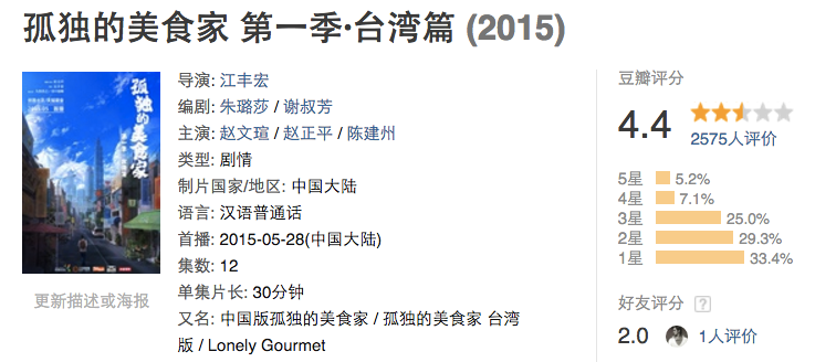 此外,除了《深夜食堂》之外,另一部日剧《孤独的美食家》去年也被翻拍成了中文版网剧。第一季“台湾篇”共12集曾在2015年5月于优酷土豆播出。赵文瑄饰演吃货“井之头五郎”。