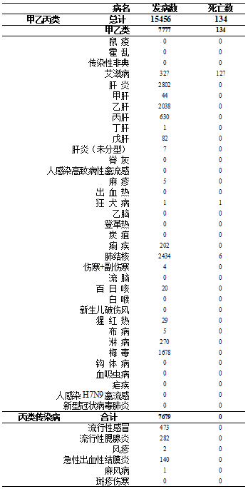 甲类传染病无发病、死亡报告。乙类传染病共报告发病7777例,较上月同期(5571例) 上升39.60%,较去年同期(6029例)上升28.99%;死亡134例,较上月同期(68例)上升97.06%,较去年同期(101例)上升32.67%;报告发病数居前3位的病种依次为肺结核、乙肝、梅毒。