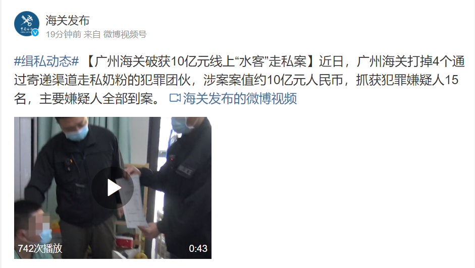 据@海关发布 消息,近日,广州海关打掉4个通过寄递渠道走私奶粉的犯罪团伙,涉案案值约10亿元人民币,抓获犯罪嫌疑人15名,主要嫌疑人全部到案。