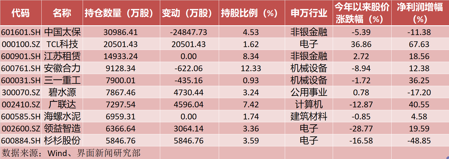 新进个股中,持股数量超1000万股的有9只。值得注意的是,去年四季度,瑞士信贷(香港)有限公司以及挪威中央银行两家外资机构共同"相中"TCL科技,合计建仓约2.05亿股,为QFII新进个股之首,按季末股价测算,合计持仓市值达14.52亿元。其次是杉杉股份(600884.SH),去年四季度,UBS AG(瑞银)以及JP摩根分别新进该股2980.44万股、2866.32万股,合计持仓市值达10.54亿元。