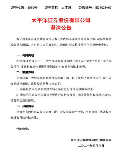 不过,就在当日深夜,太平洋就发布公告称,2021年4月8日下午,太平洋证券注意到有媒体报道称华润或京东有意向收购公司。澄清声明如下:公司向第一大股东北京嘉裕投资有限公司发出问询函进行函证,嘉裕投资函复内容如下:1。嘉裕投资未与京东就股份转让事宜进行过任何接触或讨论。2。华润的关联公司与嘉裕投资进行过初步接触,未签署任何股份转让协议,目前无实质性进展。