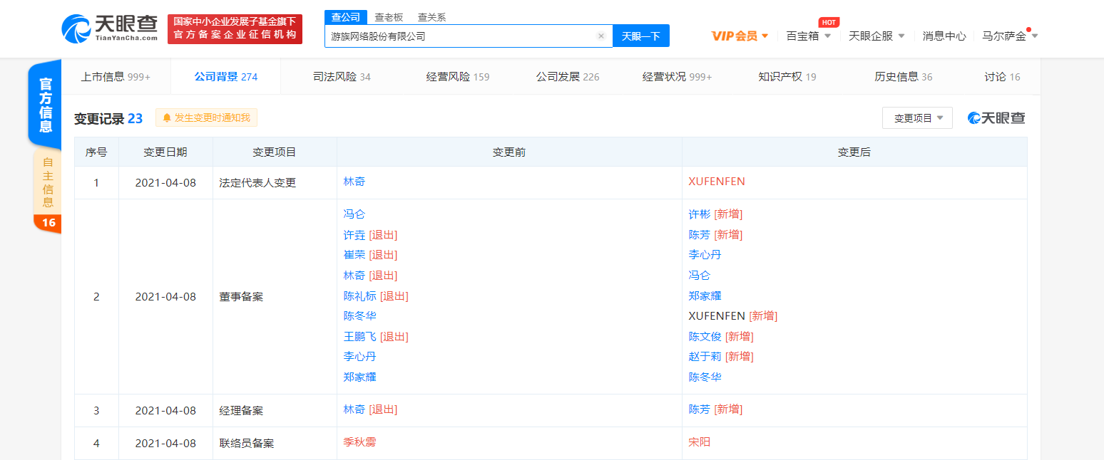 据天眼查APP显示,4月8日,游族网络股份有限公司发生多项工商变更,法定代表人由林奇变更为XUFENFEN(许芬芬),同时,许垚、陈礼标等退出主要人员,新增许彬、陈文俊等人。