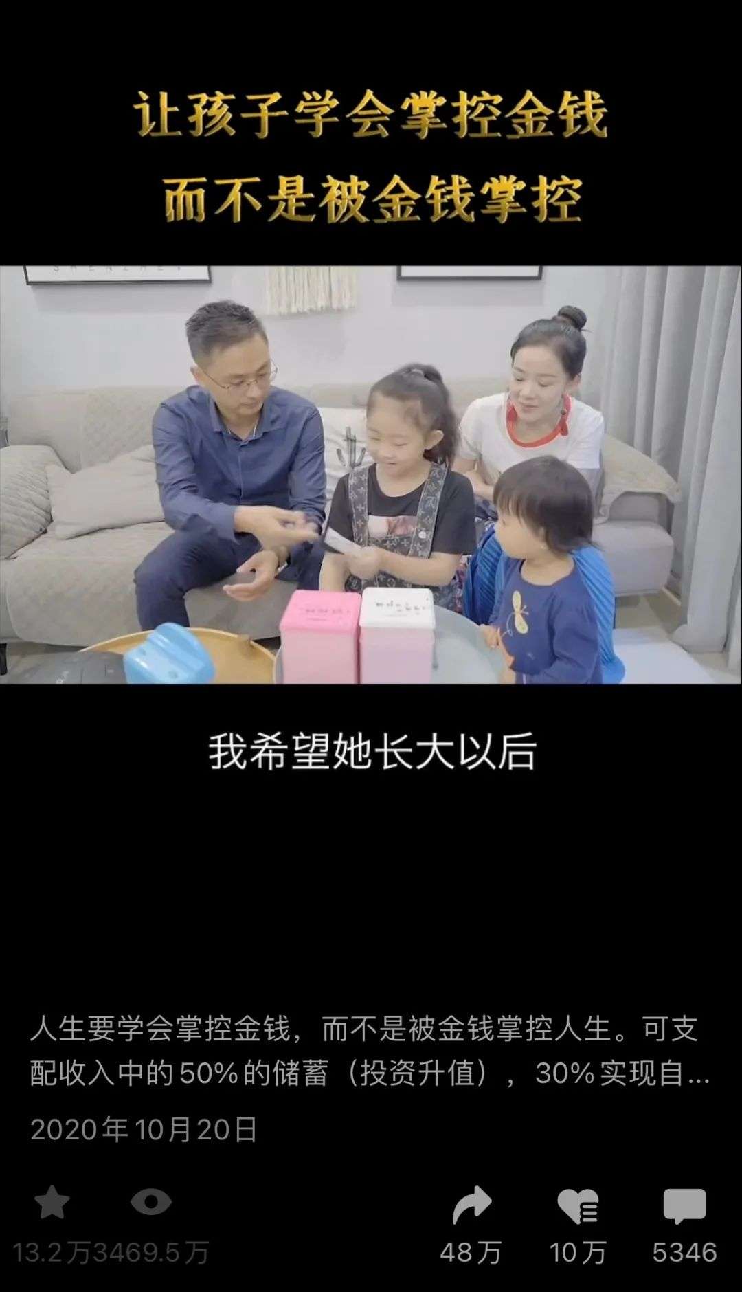 去年10月,刘筱曾发布一条“教小孩管理金钱”的视频。原本流量平平的视频在发布一个月后意外引起48万转发,流量远远超过了他所擅长的情感心情类内容。刘筱分析,这可能是因为他的用户群体大多是30-40岁之间的小孩父母、尤其是宝妈所致。