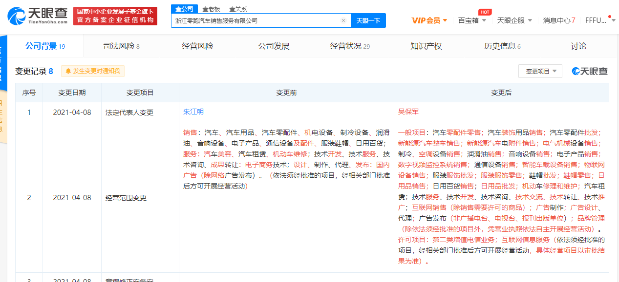 据天眼查APP显示,4月8日,浙江零跑汽车销售服务有限公司发生多项工商变更,原法定代表人朱江明退出,新增吴保军。同时,该公司经营范围新增汽车零配件零售、汽车装饰用品销售、汽车零配件批发、新能源汽车整车销售、新能源汽车电附件销售、智能车载设备销售、互联网销售等。