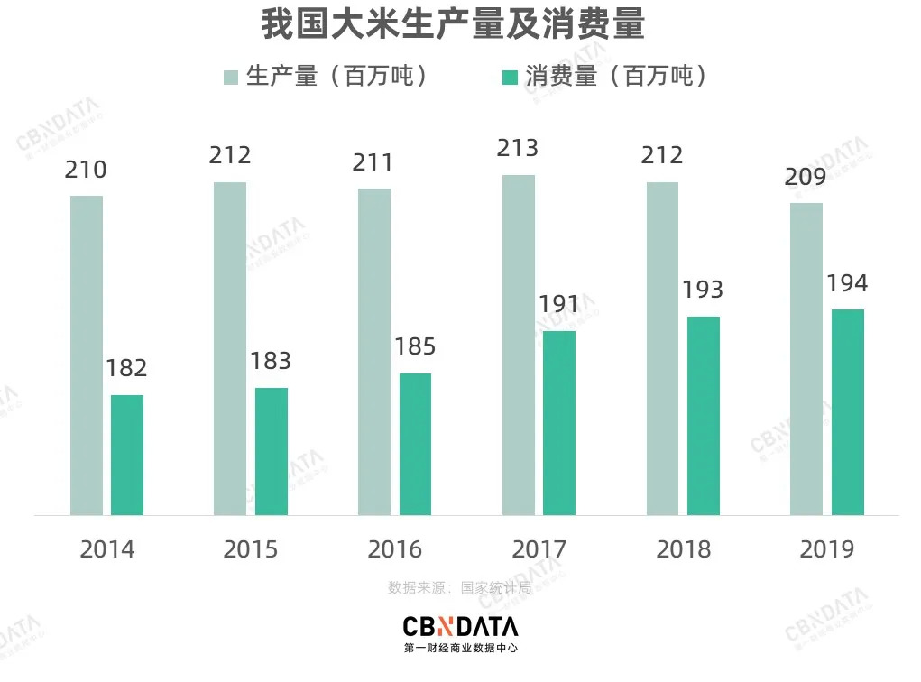 由于经济水平的提高,人们主食选择更加丰富,大米消费量从2016年起增速明显下降。