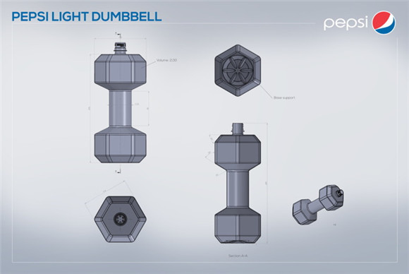 两升百事轻怡瓶摇身一变变成了两公斤的哑铃,百事可乐希望消费者健身累了来一口,运动解渴两不误。