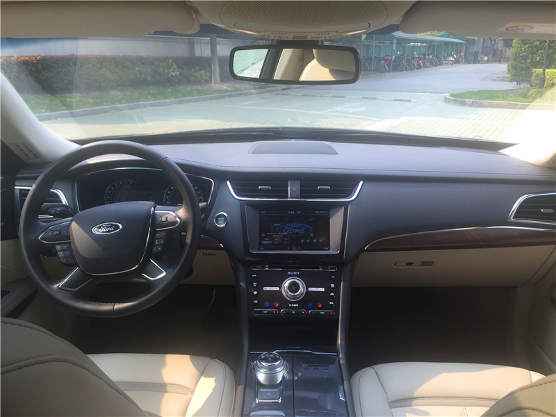 内饰设计上,作为一款行政级豪华轿车,简洁低调是必需的,没有过多的装饰,给人一种熟悉舒适的感觉。不过在配置上该车可以说做到了极致,类似捷豹的E-Shifter电子旋钮式换挡器,全真皮的中控台、多功能液晶仪表盘,全车多达4个按摩座椅,全系标配的7个安全气囊,以及顶配车型上的后排安全带气囊、三区恒温空调、ACC自适应巡航系统、车道偏离警告系统、第二代的SYNC影音娱乐操作系统,城市预碰撞系统,全景天窗,电动遮阳帘,自动泊车辅助等等高级配置是应有尽有。车内还拥有多处电源接口,方便各种电子设备充电。这么多高科技驾驶辅助系统的运用,让驾驶该车变得非常容易和安全。