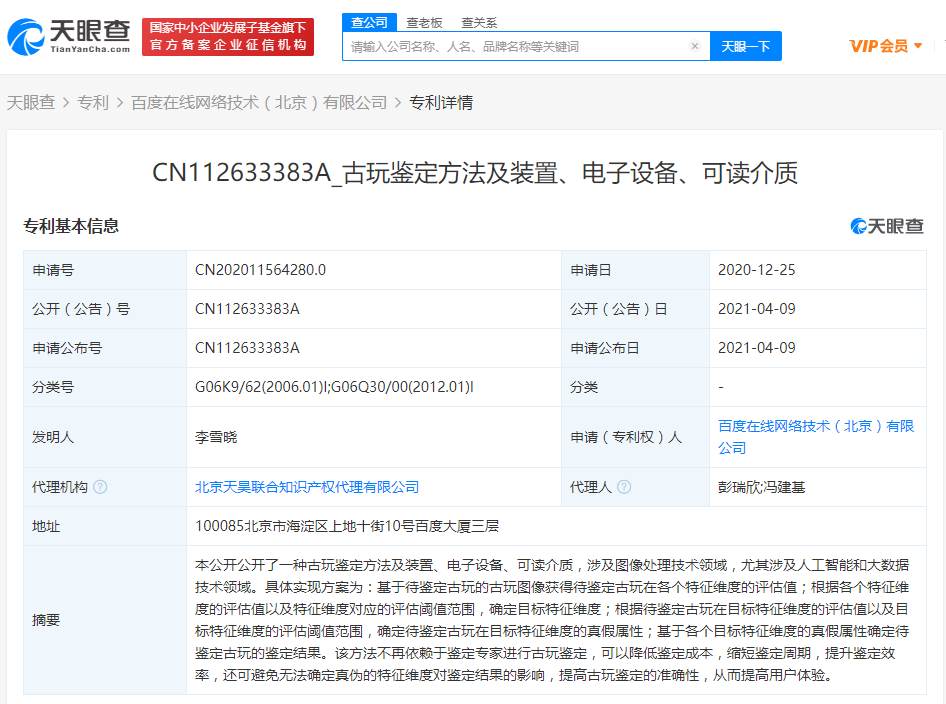 据天眼查APP显示,4月9日,百度在线网络技术(北京)有限公司公开一项名为“古玩鉴定方法及装置、电子设备、可读介质”的发明专利,公开号CN112633383A,申请日期为2020年12月。