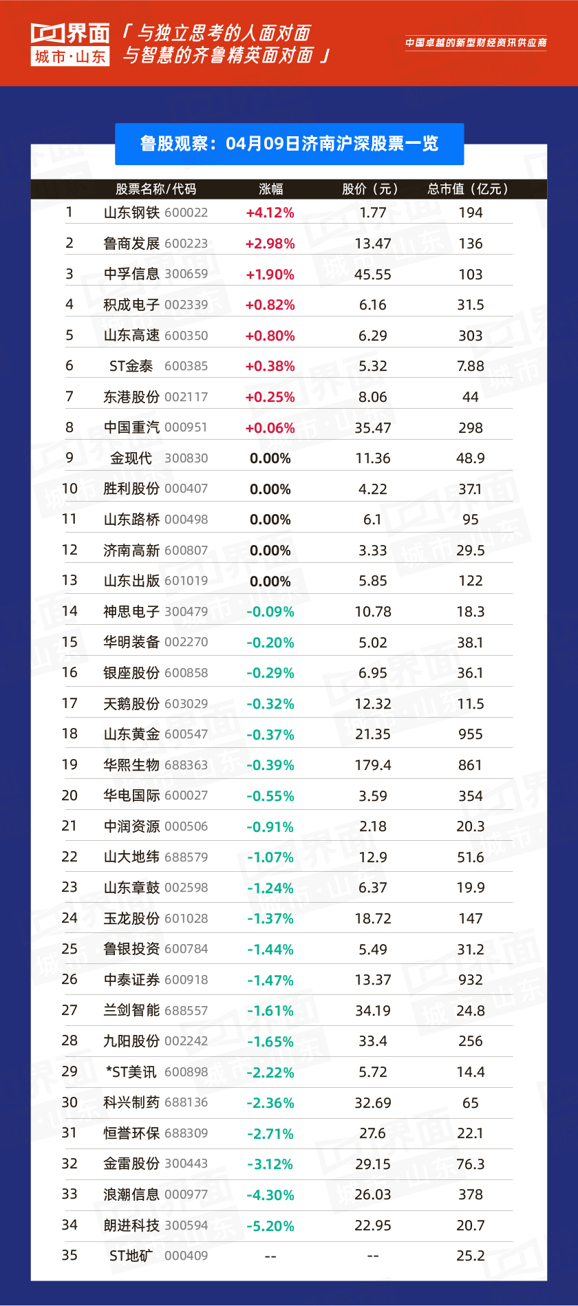 济南市涨幅榜首:山东钢铁(600022),涨幅4.12%,股价1.77元,总市值194亿元;