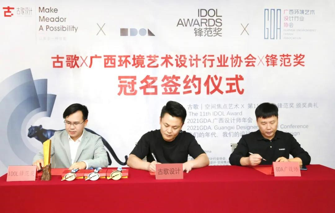 古歌艺术工厂——空间焦点艺术获得媒体和GDA广设协会长韦静云等人充分肯定。随后,古歌设计公司总经理唐伟、广西环境艺术设计行业协会韦静云会长、IDOL锋范奖创始人/总编辑黄日伦三方就4月18日将举办的颁奖典礼和GDA广西设计师年会举行冠名签约仪式。