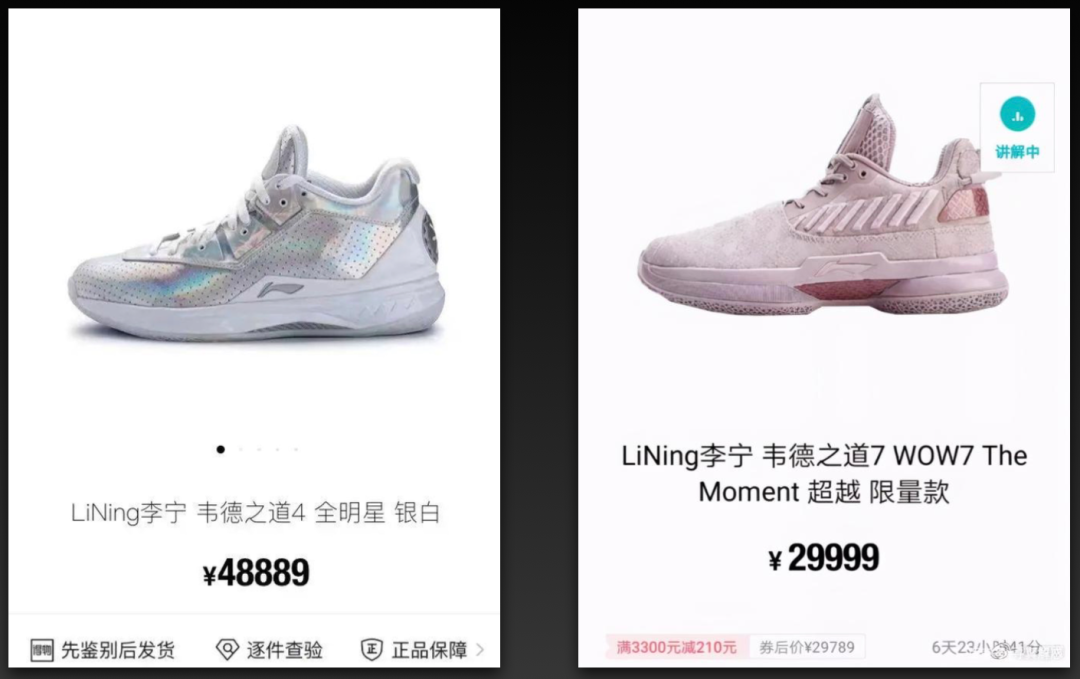 在二级市场经历了一轮强势涨价之后,发售价格为1699的李宁韦德之道7超越限量款售价,在「得物」平台被炒到了惊人的29999元,上涨近17倍;而另外另一款李宁韦德之道4全明星银白款更为夸张,标价一路飙升至48889元,相比于1499的发售价格,涨幅高达30倍。