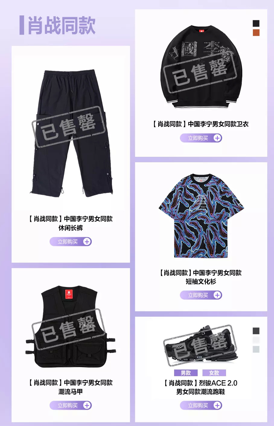 这些肖战同款一经上线,销量也十分可观。截止北京时间3月26日当日晚六点,根据李宁官网显示,同款卫衣、同款休闲长裤、同款跑鞋以及同款马甲便均已售罄。