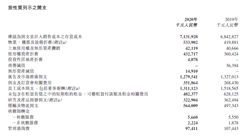 但是对李宁而言,依赖「时装周」以及潮流文化的营销模式,也带来了新的挑战。根据李宁最新发布的2020年财报,李宁年度营销费用(广告及市场推广开支)为12.8亿元,较2019年度的13.27亿元略有下滑,仅下滑3.54%。而对比来看,其研发投入3.23亿元,较2019年度大幅下滑11.02%。