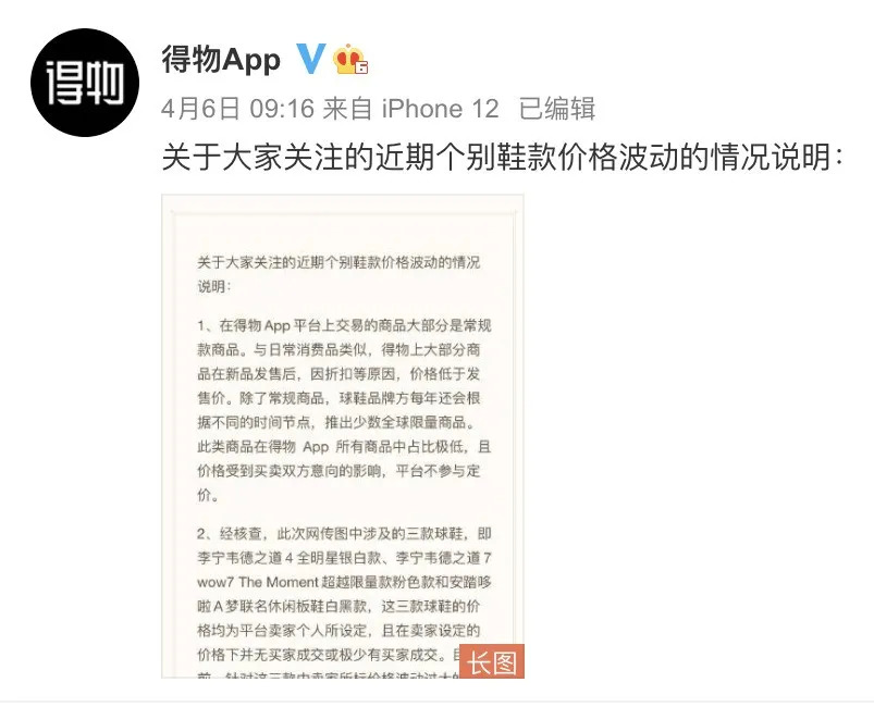 而作为事件主角之一的「得物」平台,也在4月6日通过官方微博,针对此事发布声明。声明称,近期网传图中涉及的三款球鞋(李宁韦德之道4全明星银白款、李宁韦德之道7 WOW7 TheMoment超越限量款粉色款和安踏哆啦A梦联名休闲板鞋白黑款),价格均为平台卖家个人所设定,目前已进行下架处理。