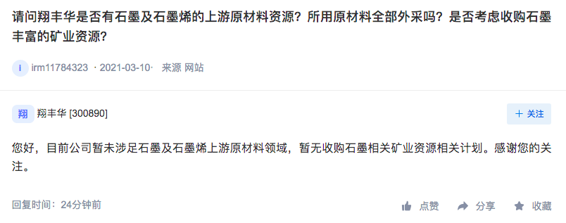 4月9日,翔丰华在“互动易”上表示,目前公司暂未涉足石墨及石墨烯上游原材料领域,暂无收购石墨相关矿业资源相关计划。