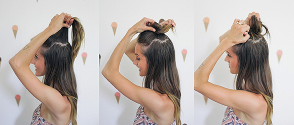 - 将固定好的小马尾以头绳为中心旋转,直到成为个丸子,再用夹子或另一根头绳固定。