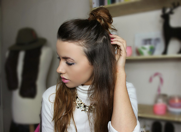 这种走累了头的英文名叫 Half Bun,取意自丸子头的 Bun,作为一半头发梳成丸子一半散开的半丸子自然得名 Half Bun,缩写为 Hun。