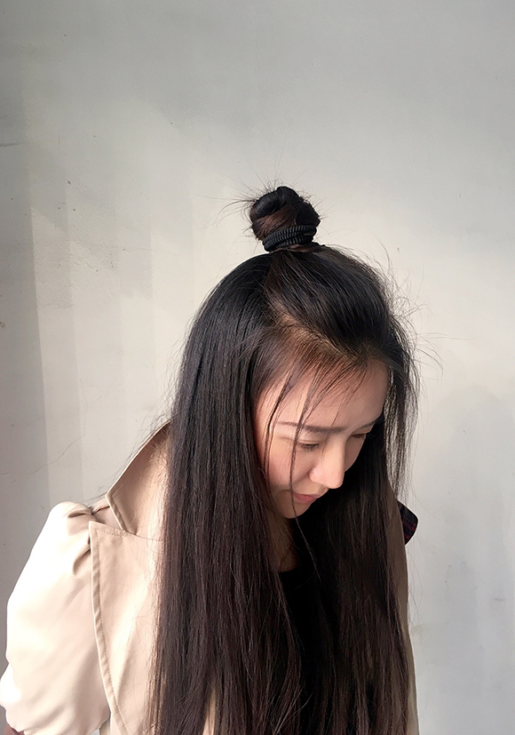 然而根据每个人发质和发量的不同,Hun 的绑法亦不可同一而语。譬如发量比较稀疏的,简单把发辫弯折一下就可以成型:
