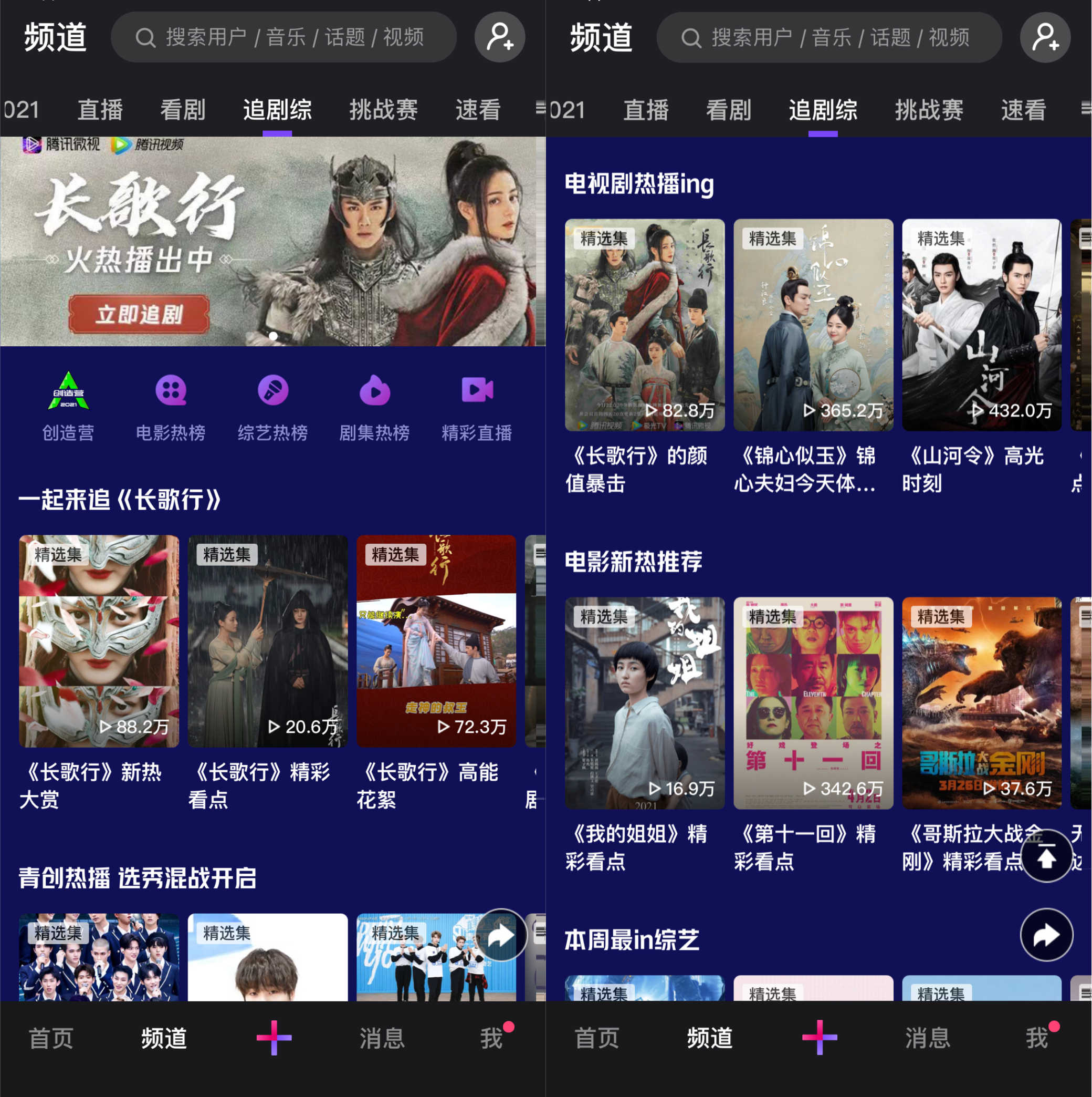 与随刻APP相似,腾讯旗下的短视频平台微视设置追剧综频道,其中内容包括热门影视作品剪辑片段构成的“精选集”,涉及的影视综作品不仅包括腾讯视频的版权内容,也包括其他各平台的热门剧综。