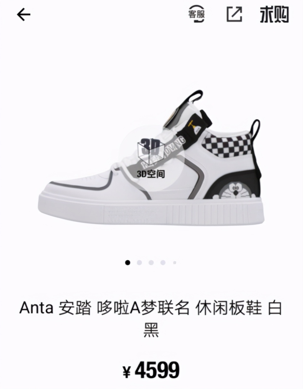 以安踏哆啦A梦联名休闲板鞋白黑款为例,发售价格是499元,3月下旬的交易价格还维持在1500元上下,现在则飙升到了最高4599元,涨幅高达8倍之多。