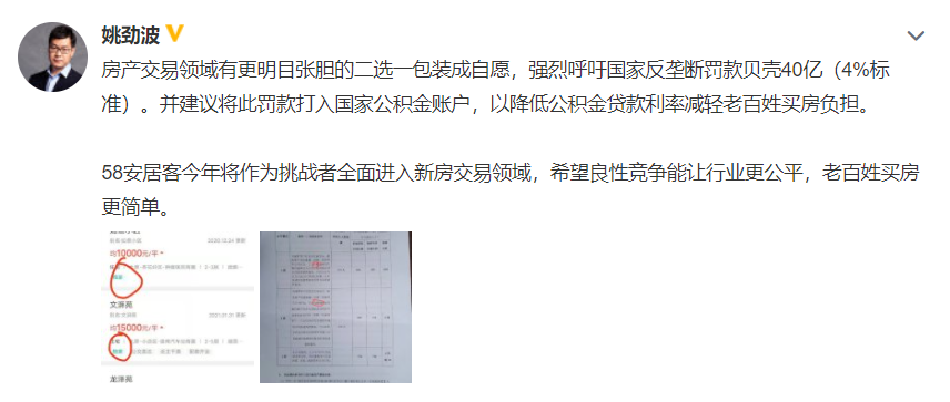 4月10日午间消息,58集团CEO、安居客董事会主席姚劲波在微博发文,称“在房产交易领域有更明目张胆的二选一包装成自愿,强烈呼吁国家反垄断罚款贝壳40亿(4%标准)。并建议将此罚款打入国家公积金账户,以降低公积金贷款利率减轻老百姓买房负担。”
