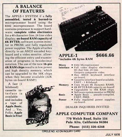 1976年7月苹果发出首支广告。这张黑白广告详细描述了Apple I电脑的配置。苹果的商业广告历经了最初的创意十足到几乎是不断重复的过程。现在,苹果似乎找到了它所需要的平衡点。