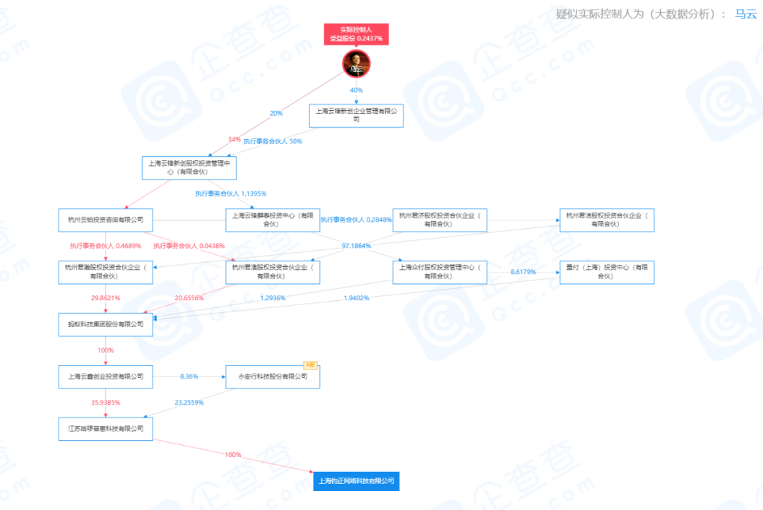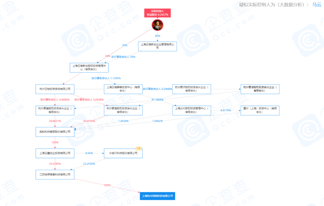 据企查查股权穿透显示,哈啰的两家主体公司上海钧丰网络科技有限公司以及上海钧正网络科技有限公司的疑似实际控制人都为阿里巴巴创始人马云。