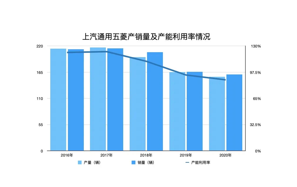 2017年至2020年,五菱的营业收入1055亿元降到729亿元,净利润从53亿元降到1.42亿元,利润急剧萎缩。相应的,五菱的产、销量双双下跌,产能利用率从超负荷的123%降到88%。