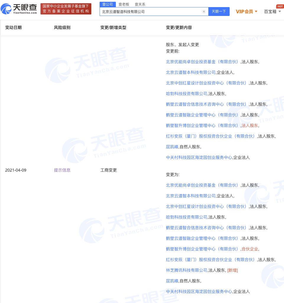据天眼查APP显示,4月9日,北京云道智造科技有限公司多项工商变更,新增股东林芝腾讯科技有限公司,持股比例6%;注册资本从4187.3033万元变更为4454.578万元,增幅为6.38298%。