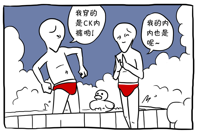 你一定见过把内裤的上沿穿着露在腰带上面的人,通常内裤的品牌显示的是CK Calvin Klein。这是年轻人对于时尚青涩追求的一个标志。