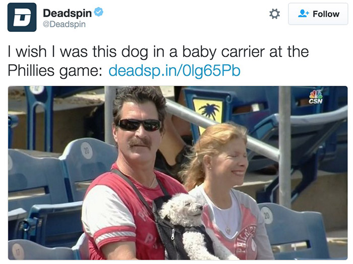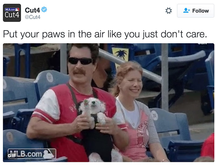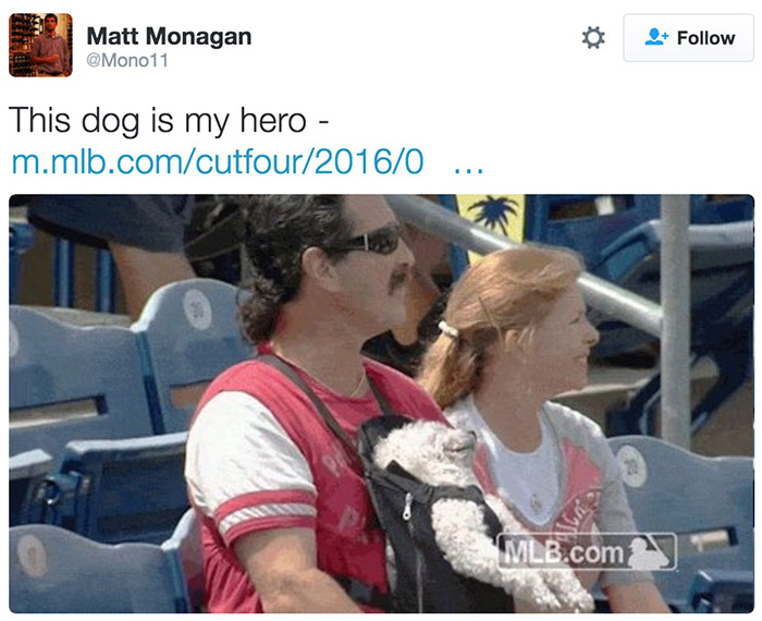 除了比赛本身,美国职业棒球大联盟最好看的地方就是看台上的观众了。在最近一场MLB比赛中,镜头捕捉到了看台上的一只狗,这只白色小狗悠闲的靠在主人怀中,似乎在眯着眼享受阳光和比赛。
