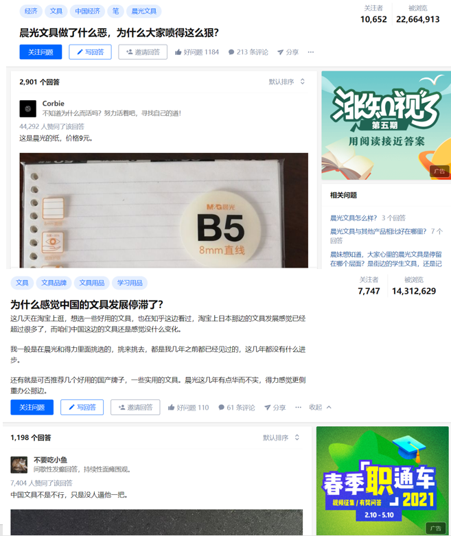 这也是“晨光文具做了什么恶,为什么大家喷得这么狠”登上知乎热门榜的重要原因之一。而在另一个“为什么感觉中国的文具发展停滞了?”的问题中,也充斥着对晨光文具的指责。