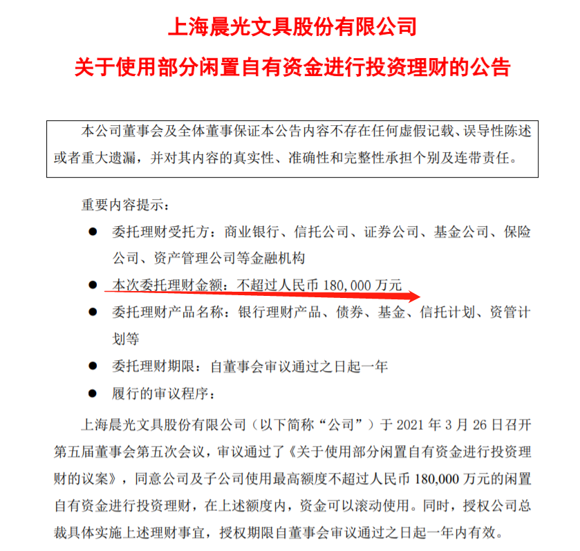 “富得流油”的晨光文具宣布了大规模分红,拟每10股派现金红利5元(含税)。在此基础上,晨光文具还拟使用部分闲置自有资金进行投资理财,金额不超过18亿元。