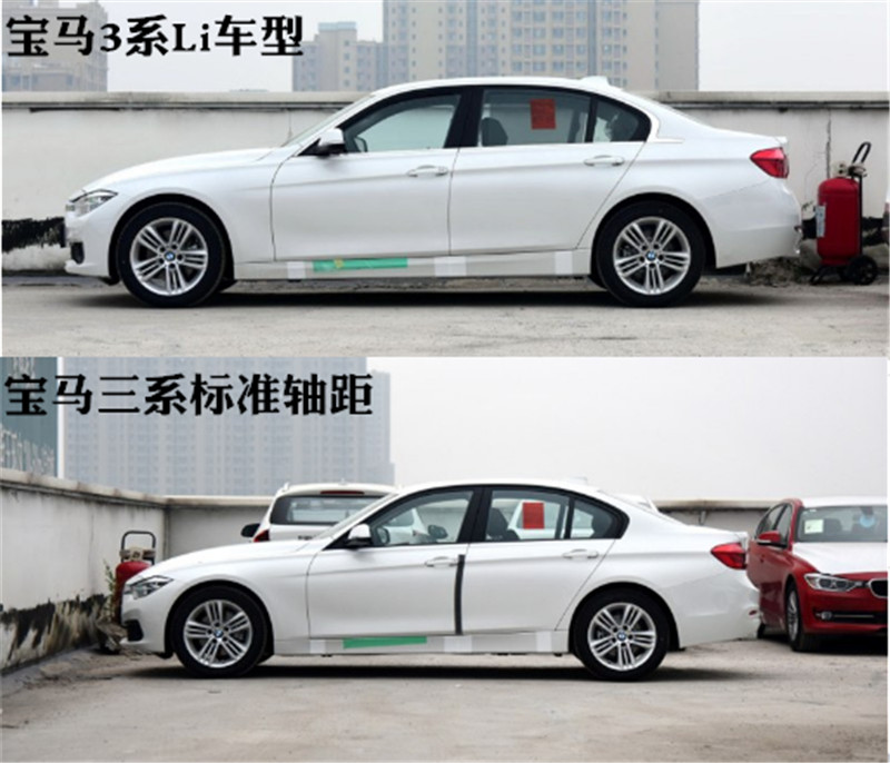 一般来说,为了保持车身协调,增加轴距后,相应的车身会做的更长。以宝马3系Li车型和标准轴距车型对比来看,Li车型较标准轴距车型在轴距上增加110mm后,车身也相应的加长了110mm。由此带来的直接效果是,在视觉上Li车型要明显大于标准轴距车型。