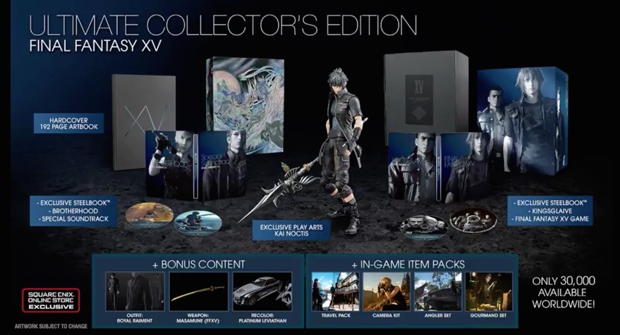 除了为首发预定首发版的玩家提供了各自平台的独有赠品和DLC以外,官方同时为《最终幻想》粉丝们准备了供收藏的豪华版和典藏版内容,豪华版除了首发版赠品以外还将以带有天野喜孝原画的铁盒包装,并附赠《KINGSGLAIVE FINAL FANTASY XV》CG电影。而典藏版附带内容则更为充实,包括了限量手办,《最终幻想15》动画(独占第六话内容)光盘以及《最终幻想15》游戏、CG电影、动画原声音乐。
