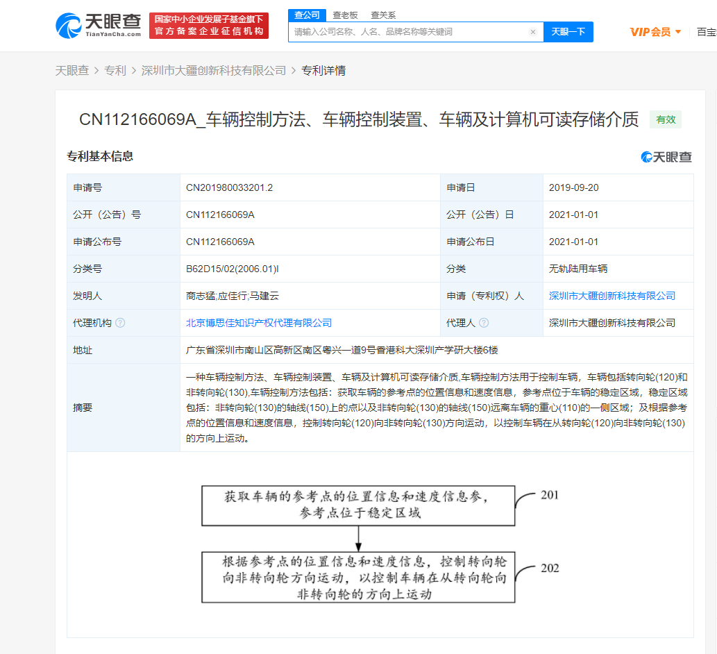 此外,该公司还公开一项名称为“车辆控制方法、车辆控制装置、车辆及计算机可读存储介质”的专利,公开号为CN112166069A,分类为无轨陆用车辆。专利摘要显示:车辆控制方法包括获取车辆的参考点的位置信息和速度信息,参考点位于车辆的稳定区域,根据参考点的位置信息和速度信息,控制转向轮向非转向轮方向运动,以控制车辆在从转向轮向非转向轮的方向上运动等。