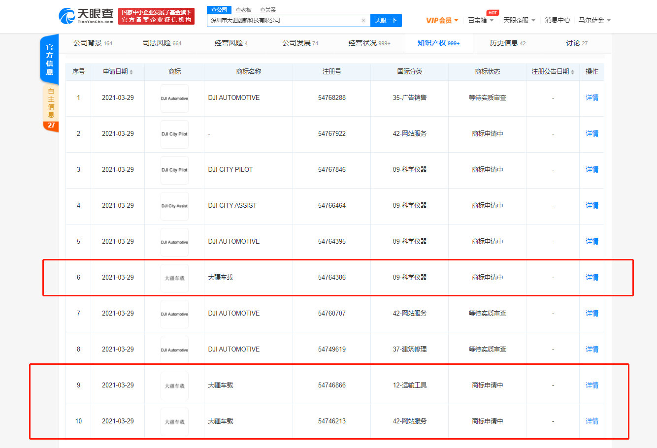 在此前的3月29日,深圳市大疆创新科技有限公司申请注册“大疆车载”相关商标,国际分类为科学仪器、运输工具、网站服务等,目前商标状态均为“商标申请中”。